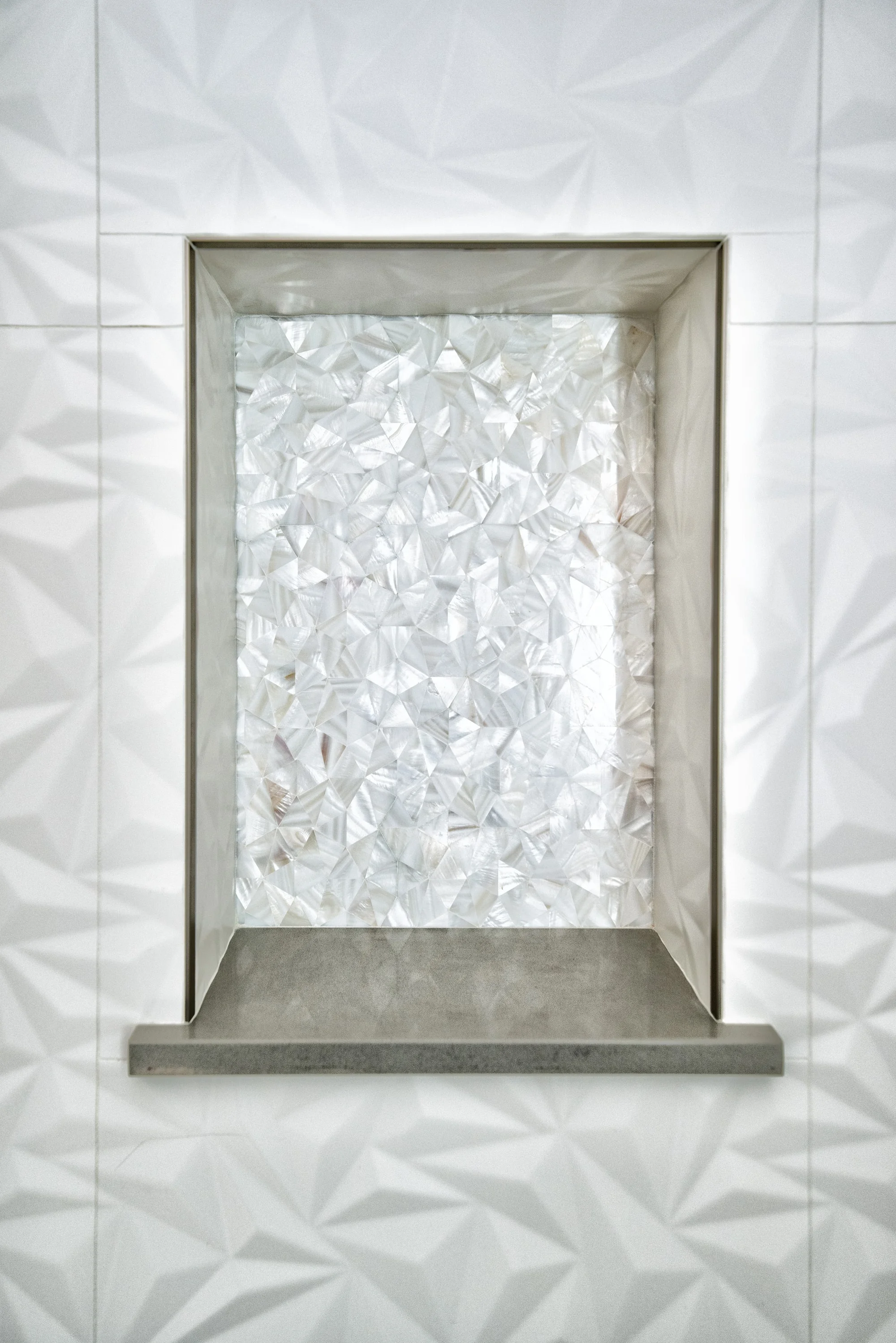 Our client was open to color, pattern and textures – our design incorporates all three. Light pink walls, a Mother of Pearl backsplash and raised geometric patterned wall tiles in the shower take this master bath from outdated to sophisticated.